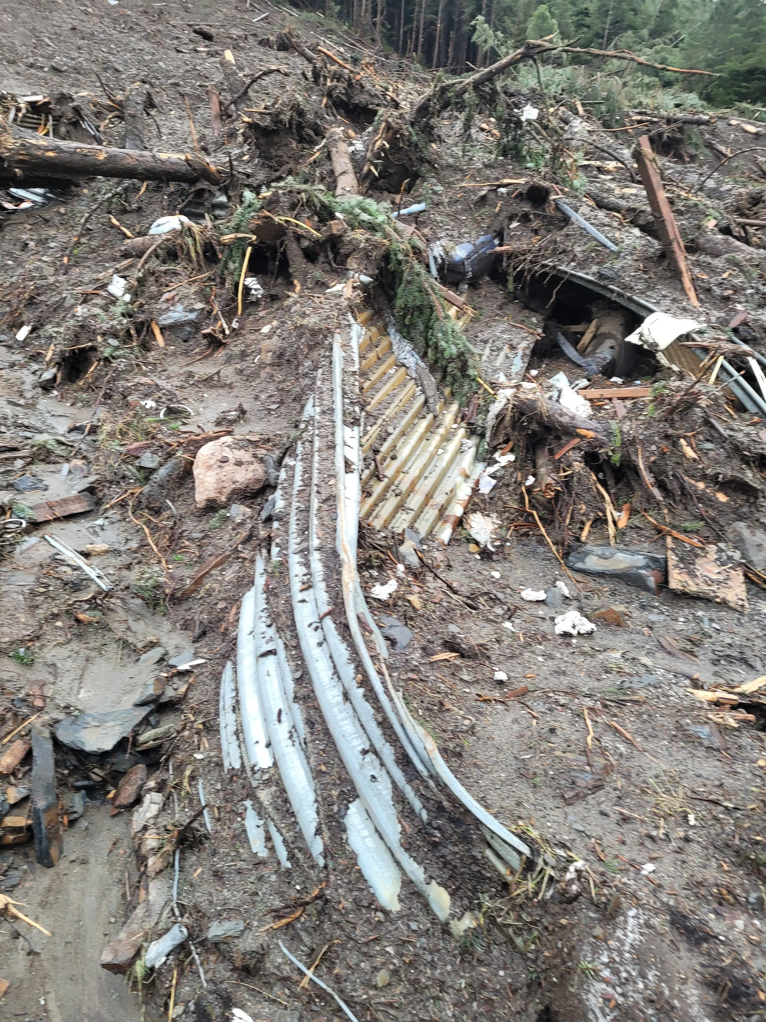 Shallow soil, though, does not mean small trees. The mountainside above our home held many thousands of conifer trees in excess of 90” tall, all the way to the very top of it. The trees’ roots graft themselves together to form an interlocking mat of roots to support the height of the trees-which mat holds all together in the very heavy rainfall that often occurs. But, about a decade ago, an insect infestation spread, and the slope above our home had many dying trees. (note the yellowish trees in the photo) Dying trees that failed to hold the soil and became juggernauts of destruction hurling down at 35 mph.